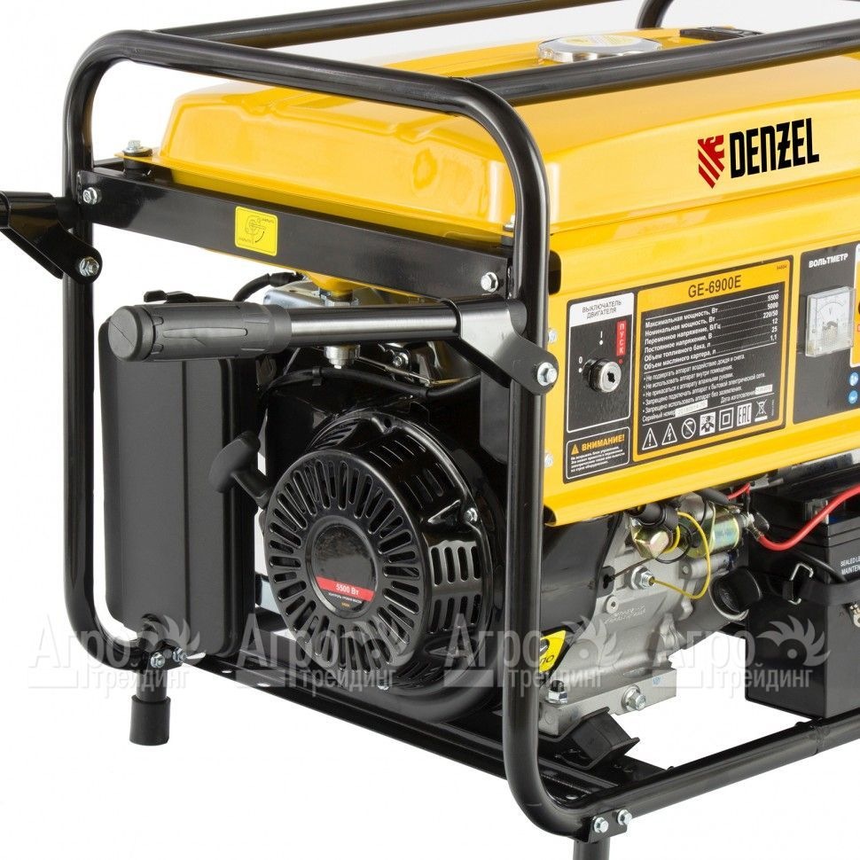 Характеристики товара: Бензогенератор Denzel GE 6900E 5 кВтПодробное описание товараБензогенератор Denzel GE 6900E 5 кВт – это экономичная и мощная миниэлектростанция, предназначенная для бытового и коммерческого использования. Данная модель будет полезна в загородном доме, на даче, строительной площадке, в гараже или мастерской. Её мощности хватает, чтобы подключить все основные бытовые потребители и электроинструмент и оборудование. К особенностям бензинового генератора Denzel GE 6900E 5 кВт относят его надёжный двигатель внутреннего сгорания, производительный генератор и простую систему управления, интуитивно понятную даже неподготовленному пользователю. Мотор агрегата запускается электрическим или ручным стартером. В качестве топлива используется неэтилированный автомобильный бензин. Одной заправки топливного бака хватает на несколько часов непрерывной работы агрегата. На корпусе прибора имеются три стандартные розетки и выход для зарядки АКБ и маломощных электроустановок, работающих на постоянном токе. Выходное напряжение регулируется автоматически. Визуальный контроль осуществляется встроенным вольтметром. Всё электрооборудование имеет защиту от перегрузки и короткого замыкания. Мощная рама защищает агрегат от механических повреждений. На опорах бензогенератора установлены демпферы, эффективно гасящие вибрацию работающей машины.